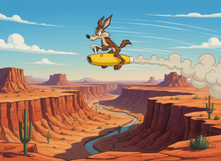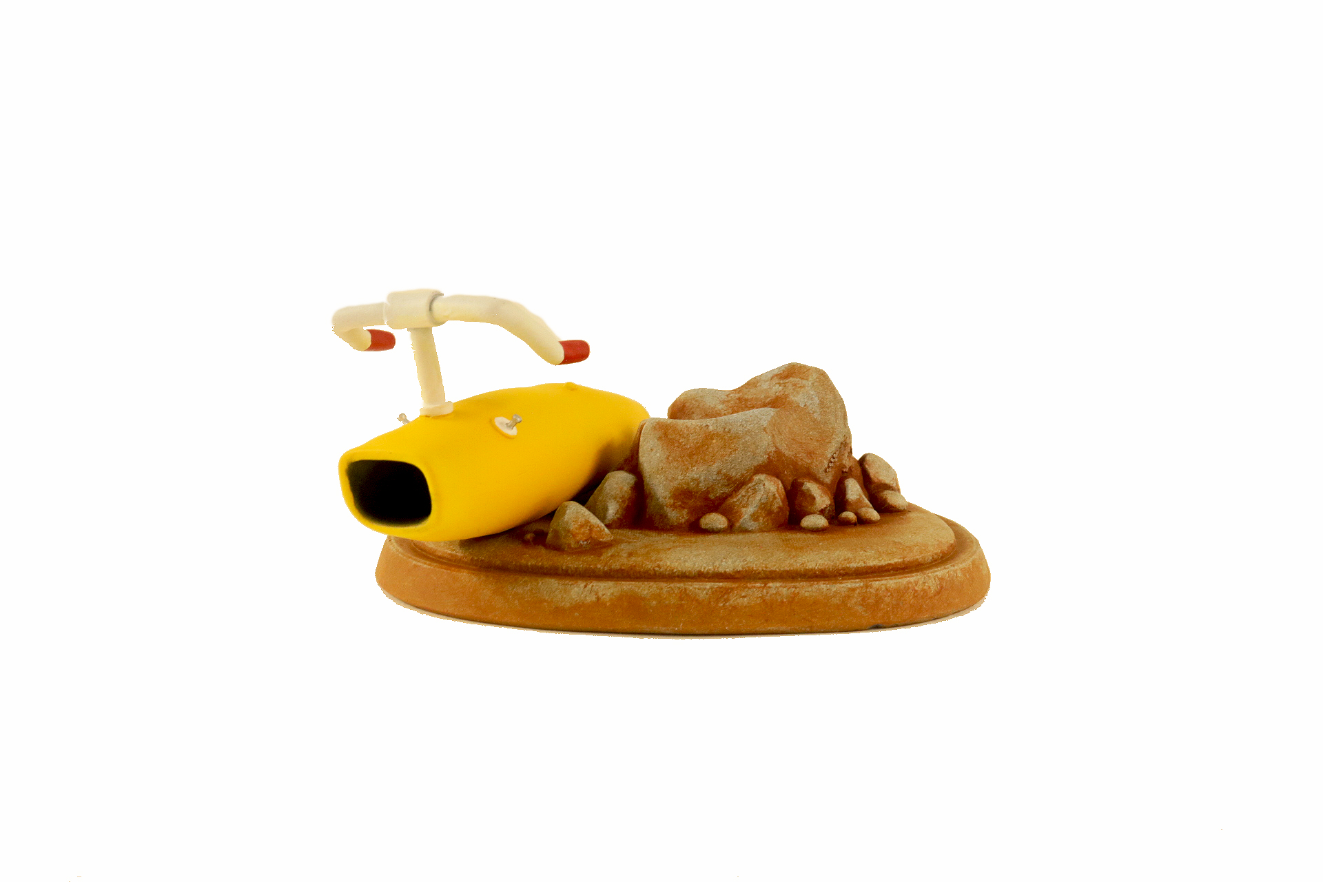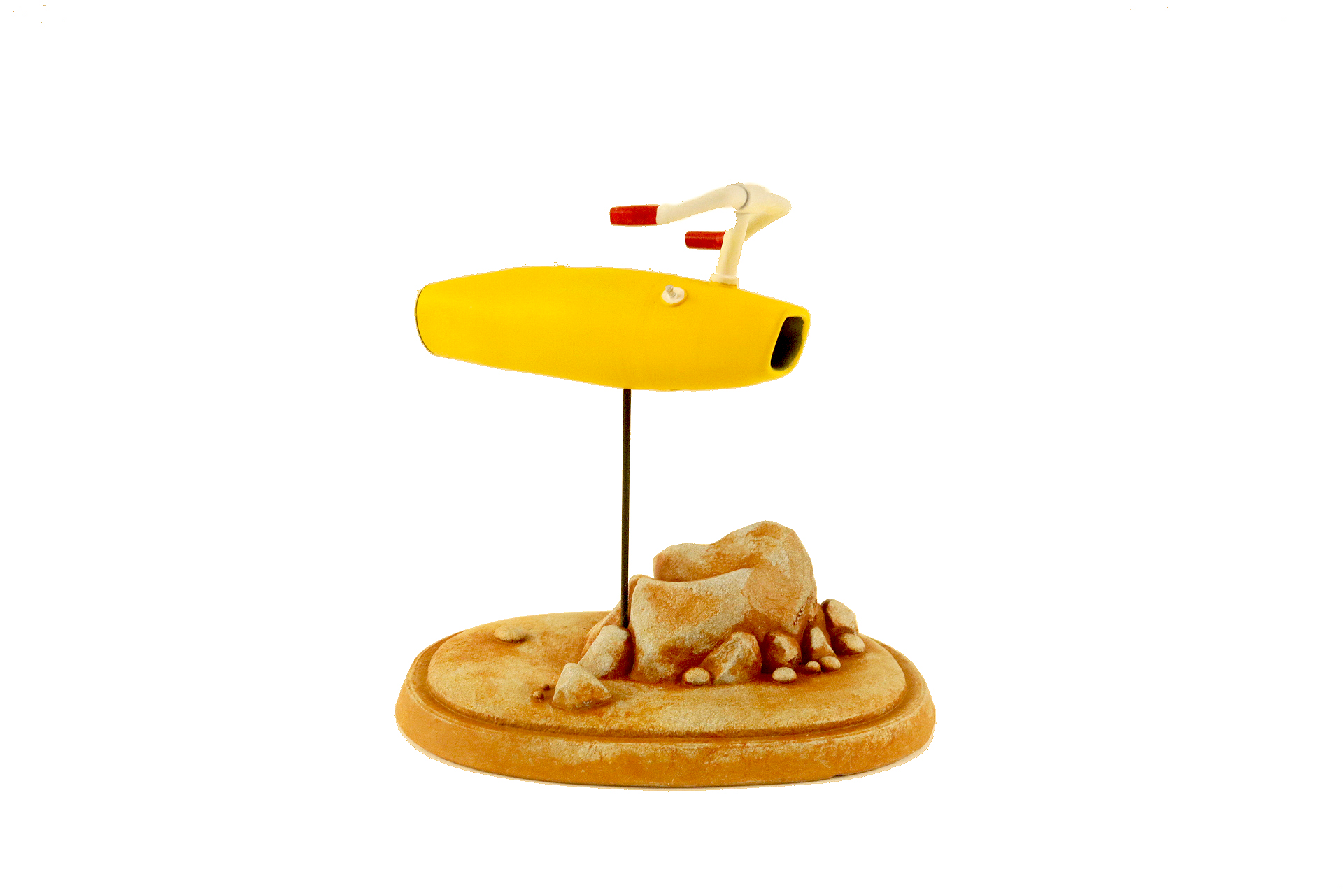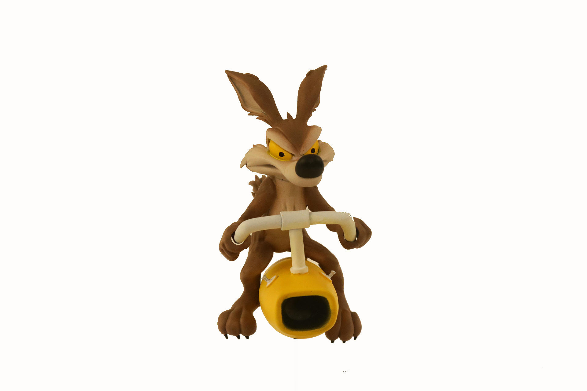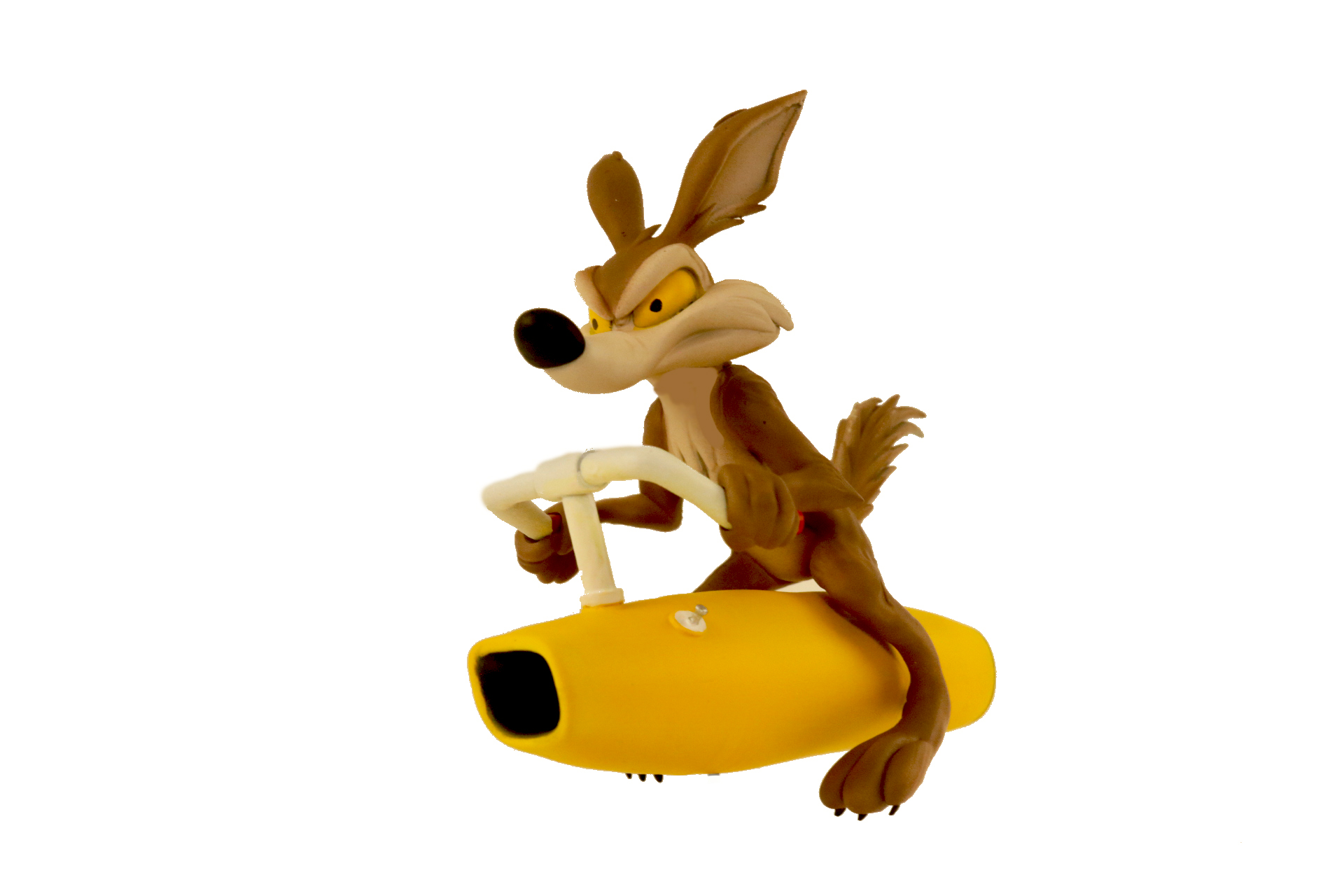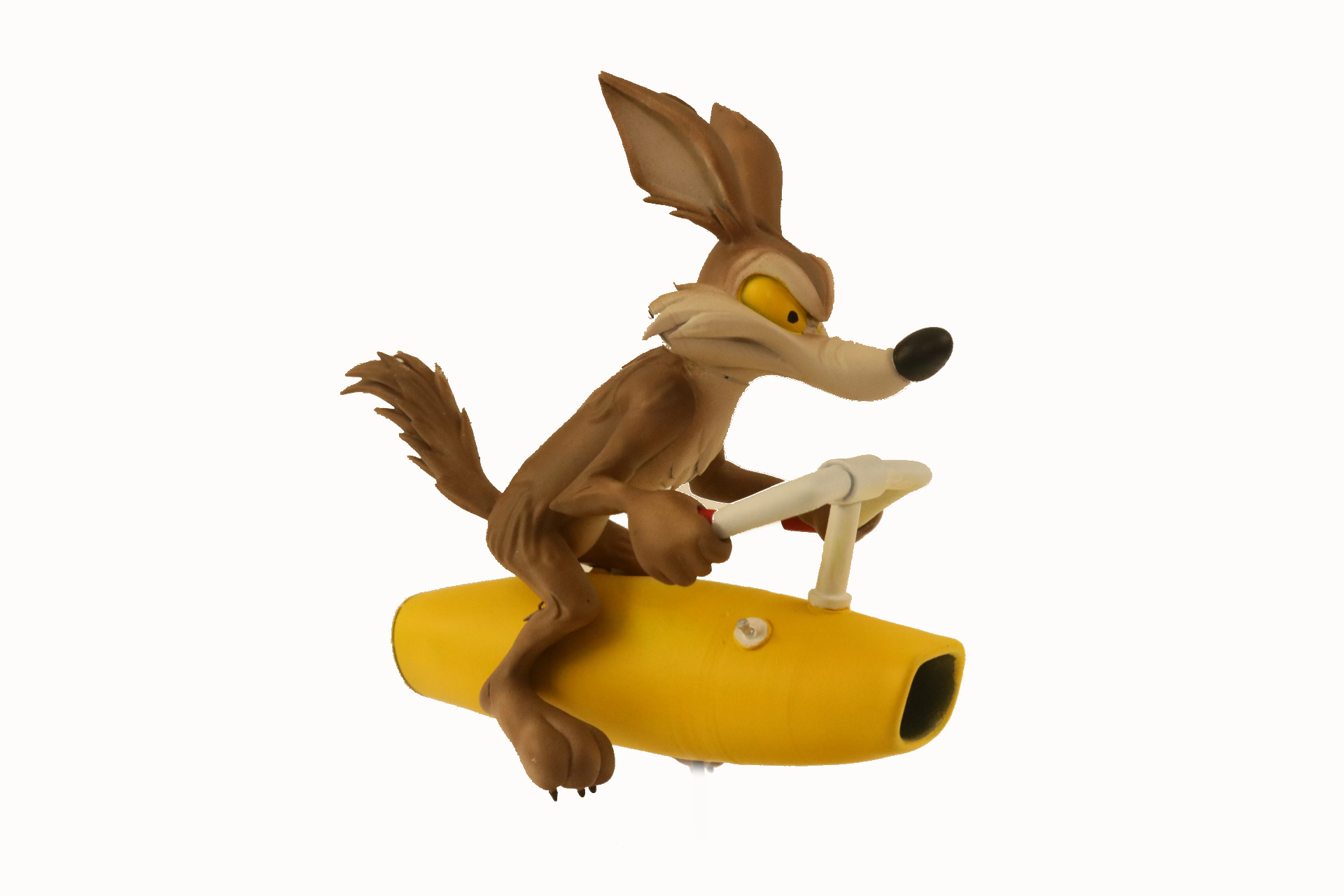 This model display is based off the “Wile” Jet Bike plan to outrun & capture is adversary the fastest bird in the desert a road runner. In his attempt to build the jet powered rock bike he forgot that his creation has no brakes, so in his pursuit he catches up with his rival only to be foiled again in his attempt to capture his pray.